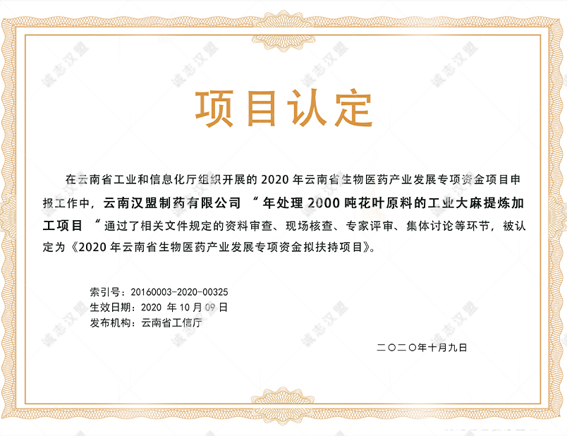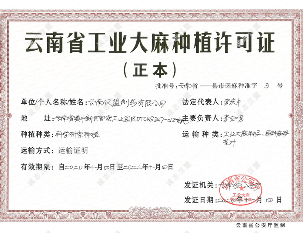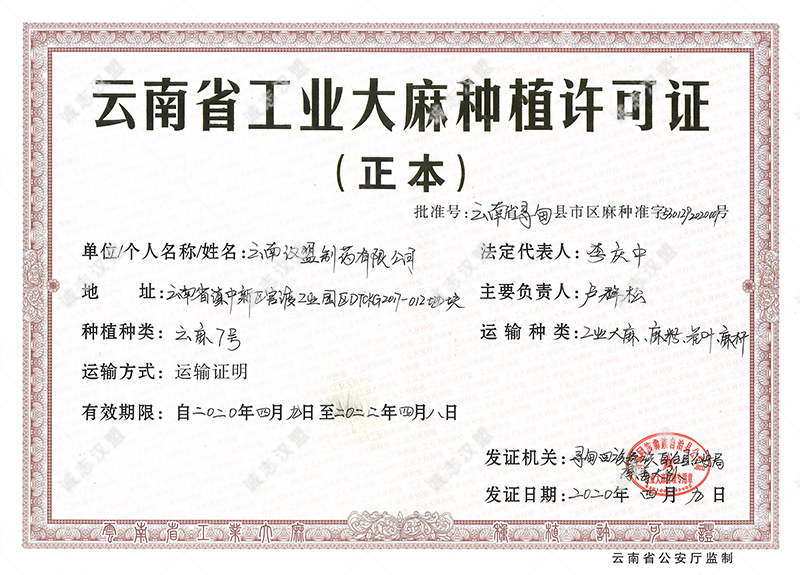 云南省工業(yè)大麻種植許可證(工業(yè)原料種植)